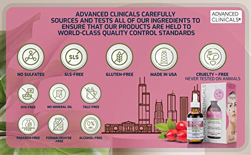 MOISTURIZING AND EXTREME HYDRATION- Restore your skins youthful appearance with this top rated anti-aging face oil from Advanced Clinicals. Rosehip oil calms and hydrates any skin type (dry skin, oily skin, and sensitive skin) for a brighter complexion and improved elasticity.