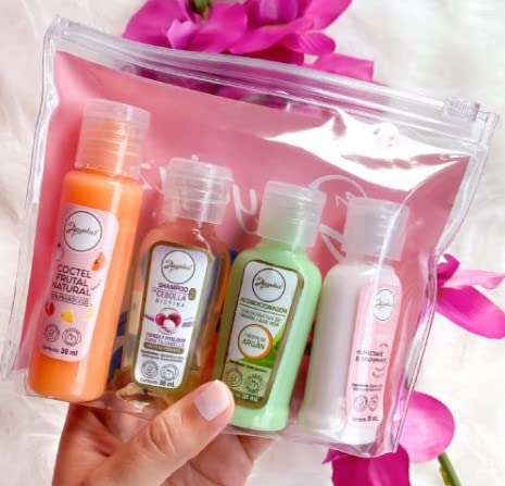 Anyeluz 1.0 OZ | 4 Piece Travel Kit TSA Compliant Essentials | SHAMPOO DE CEBOLLA| ANYELUZ COCTEL DE FRUTAS| Anyeluz Acondicionador de Argan | Anyeluz Crema Reafirmante| Acelera Crecimiento, Brillo y Sedosidad