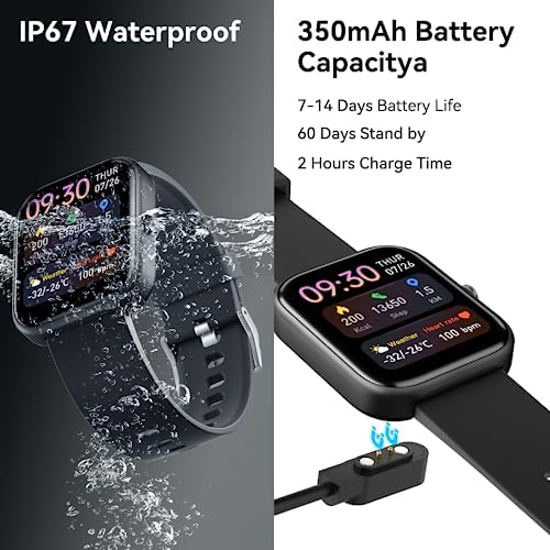【Long Battery& Life IP67 Waterproof】 The smartwatch comes with a large 350 mAh battery that lasts 7-13 days under normal conditions and 60 days of standby time on a full charge without Bluetooth connection. The smartwatch is IP67 waterproof, so you don’t need to worry about water ingress when washing hands, splashing, sweating, cold showers and rain.