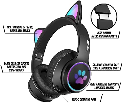 Mokata Gaming Bluetooth 5.0 Wireless Headphones Over Ear Cat LED Light Foldable Music Headset with AUX 3.5mm Microphone (Built-in) for Adult & Kids PC TV Game Music Pad Laptop Cellphone Black
