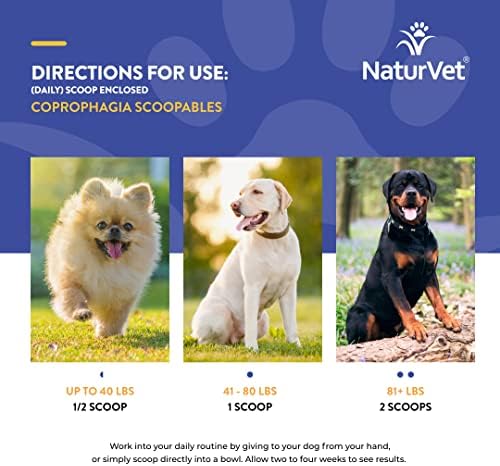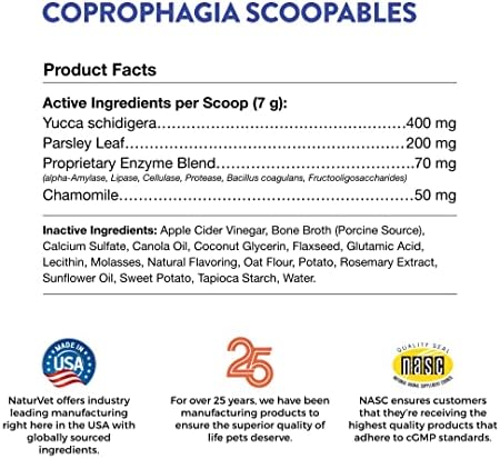 “Scoopables are flavor packed and bursting with tasty hickory smoked bacon flavor, perfect for finicky eaters and just as efficacious as our original soft chews. Veterinarian formulated for use in dogs over the age of 12 weeks. Unique blend of Yucca, Chamomile, and our proprietary enzyme blend helps to deter dogs from consuming their own stool, or other dogs’ stool, if they are also given NaturVet Scoopables Coprophagia Stool Eating Deterrent. Helps to stop that nasty habit and helps to freshen breath!”