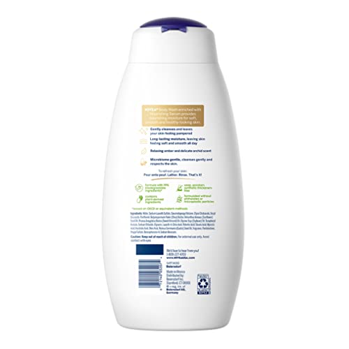 Escape the daily hustle and bustle with a relaxing shower using NIVEA Delicate Orchid and Amber Body Wash with Nourishing Serum. NIVEA pampering body wash provides essential moisture for healthy-looking skin that feels nourished. This body wash for dry skin is enriched with a unique blend of plant-derived oils, essential skin lipids and vitamins, and cares for your skin while gently cleansing. NIVEA Delicate Orchid and Amber Body Wash has a relaxing amber and orchid scent, and leaves skin feeling soft and smooth all day. You can also use this hydrating body wash as a shaving cream. This scented body wash is free of parabens and micro plastic particles. This cleansing body wash is a key part of a skincare routine and pairs well with NIVEA Oil Infused Orchid and Argan Oil Body Lotion. To use, apply body wash onto a cleansing pouf, lather onto your body, and rinse off for skin that feels hydrated and moisturized. NIVEA is a trusted leader in skin care products, with more than 130 years of expertise.