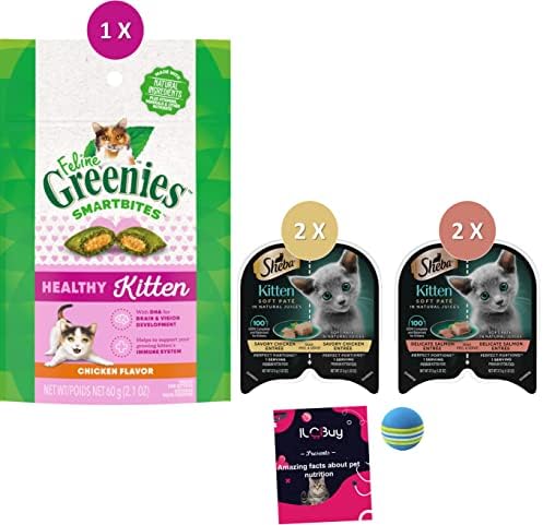 Introducing the Kitten Care Essentials Bundle, a must-have collection for any cat parent seeking the best for their little furball. This carefully curated bundle includes a variety of kitten wet food and treats from trusted brands such as Sheba and Greenies, ensuring a wholesome and balanced diet for your growing companion. This bundle is the Sheba Perfect PORTIONS Kitten Paté Wet Cat Food Trays and Greenies Feline SMARTBITES Healthy Kitten Treats. Kitten wet food variety pack Featuring a delectable combination of savory chicken and delicate salmon entrée, Sheba Perfect PORTIONS provide a range of flavors to keep your little one excited during mealtime. Each tray is designed with an easy peel twin-pack, making serving hassle-free and minimizing mess. The Sheba Perfect PORTIONS Pate is exceptionally soft and palatable, perfect for kittens transitioning from milk to solids or those with sensitive teeth. In addition to the kitten wet food, this bundle includes Greenies Feline SMARTBITES Healthy Kitten Treats. These treats are designed specifically for kittens and provide a perfect balance of taste and nutrition. The chicken-flavored treats are not only irresistibly delicious but also offer various health benefits. Greenies SMARTBITES treats are enriched with natural ingredients that support healthy skin and fur. They are also dental treats, aiding in maintaining your kitten’s oral hygiene and contributing to their overall dental health. With the Kitten Care Essentials Bundle, you can rest assured that your kitten is receiving the best care and nutrition. From the wholesome Sheba Perfect PORTIONS wet food to the flavorful Greenies SMARTBITES treats, every item in this bundle is thoughtfully selected to cater to the specific needs of your little feline friend. Give your kitten the love they deserve by providing them with this comprehensive bundle of nutrition and treats.