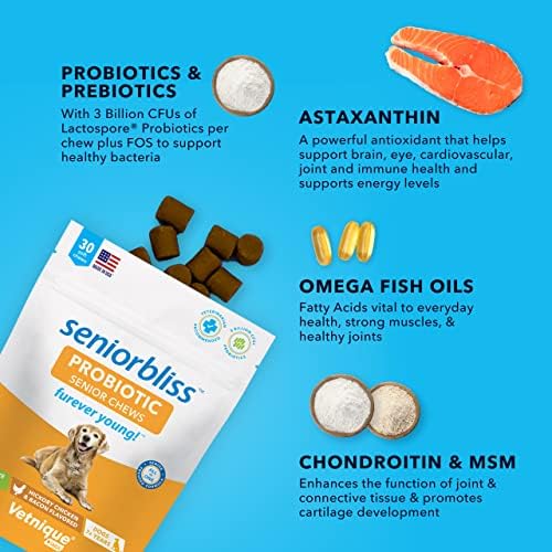 Vetnique Labs Seniorbliss Aging Dog (7+) Senior Dog Vitamins and Supplements, Supports Heart, Allergy, Arthritis, Skin and Coat – furever Young (Probiotic Chew, 30ct)